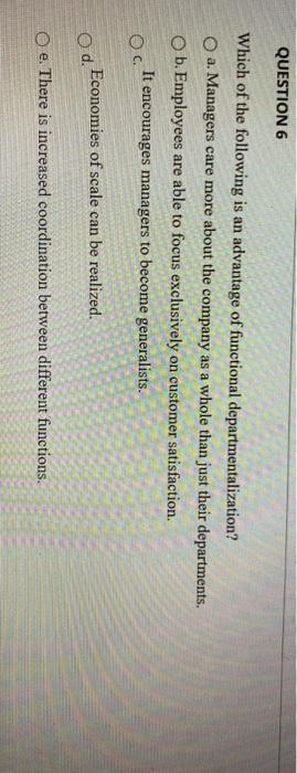 Each department can focus on a specific area or function by dividing an organization into departments. The team members work with other people in the field and it allows sharing of thoughts and knowledge to make the people learn new skills. Question 8 An advantage of functional departmentalization is that O managers care more about the company as a whole than just their departments.